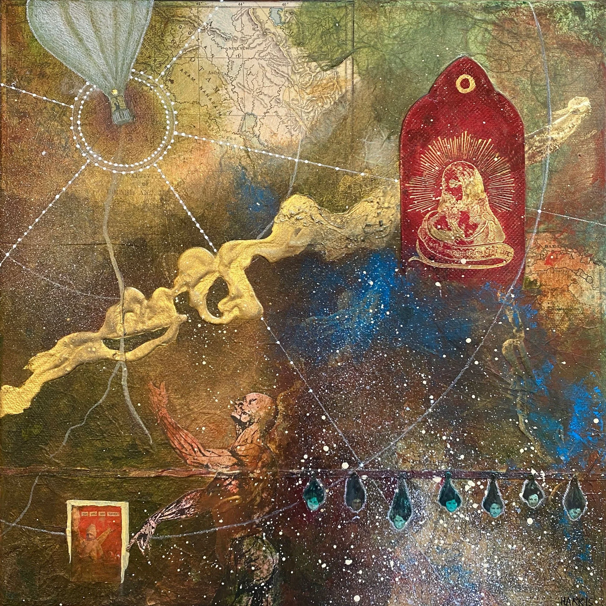 An original collage including a background image of a map of Jerusalem, overlaid with acrylic paint, images of a hot air balloon, women's heads, a gold Jesus on red leather, an anatomical image of a man, a postage stamp, and more. In shades of green, gold, tan, teal, and red.