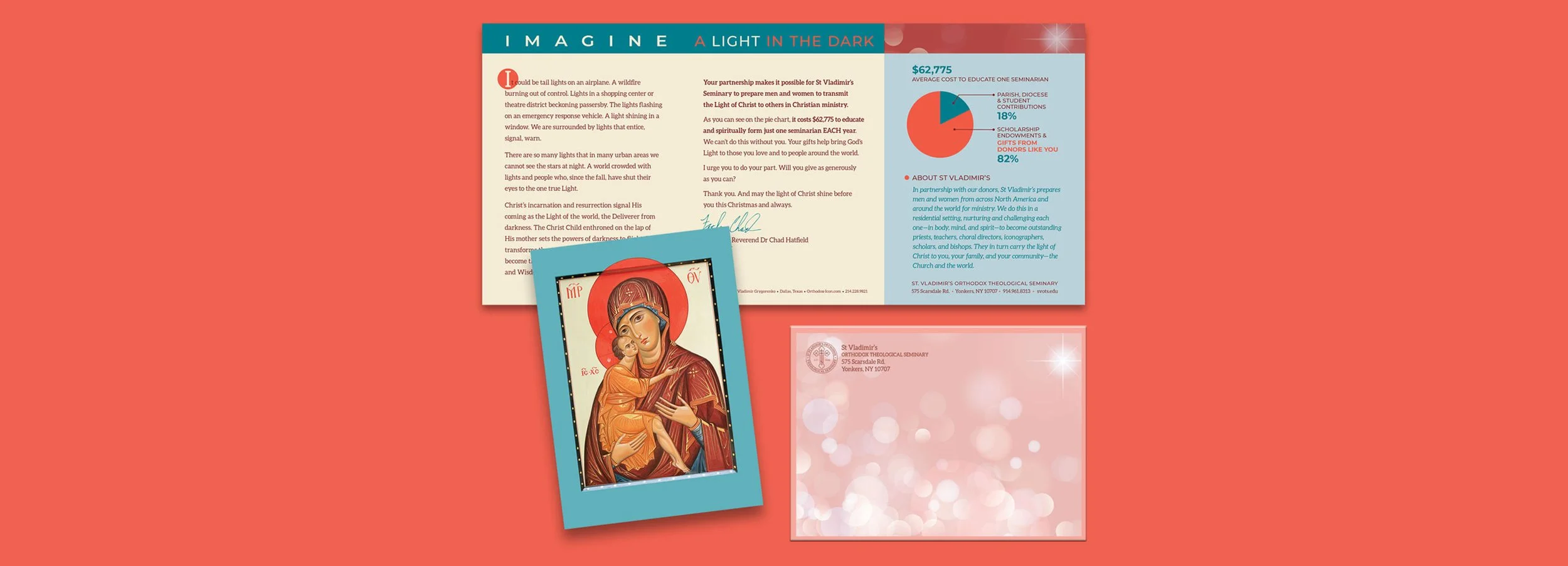 St. Vladimir’s Seminary is a Russian Orthodox non profit in Yonkers, New York. They’re always looking for fundraising pieces that are beautifully designed and effectively communicate their financial needs to their congregation with meaning and integrity. Do you need creative ideas for your next direct mail campaign? Let’s chat!